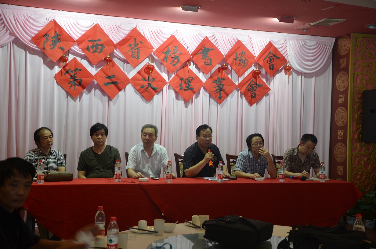 2014年7月26日,陕西省榜书协会第二次理事会议在西安西粤楼饭店成功召开,协会主席胡兴民、副主席张锦田、杨波、刁天寅、名誉主席雷社艺以及协会理事、常务理事50余人参加会议。胡兴民主席总结协会上半年工作并安排下半年工作,副主席刁天寅宣布协会新出台的一些规章制度及奖罚办法。本次会议在理事会监督下选举增补刘荣广同志为陕西省榜书协会副主席,增补高新民同志为协会副理事长。会后举办了小型笔会,参会者相互学习提高自身艺术水准。